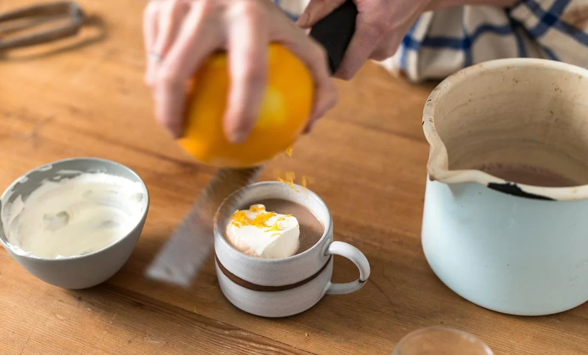 - Pour milk mixture into mug; separating and discarding the orange zest.